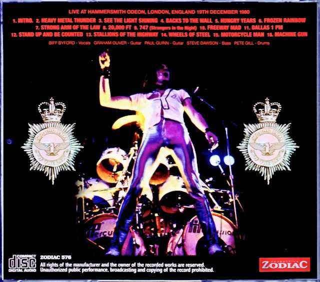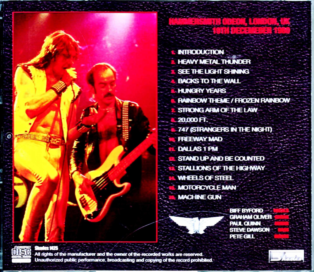 Track Listing: Heavy Metal Thunder, See the Light Shining, Backs to the Wall, Hungry Years, (cut) Hungry Years / Frozen Rainbow (cut), Strong Arm of the Law, 20,000 feet, 747 Strangers in the Night, Freeway Mad, Dallas 1pm, Stand Up and Be Counted, Stallions of the Highway, Wheels of Steel, Motorcycle Man, Machine Gun