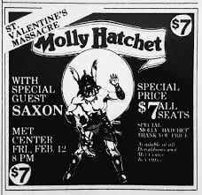 Molly Hatchet performed at the Met Center in Bloomington, Minnesota, on February 12, 1982. Tour/Event: The concert was part of their “Take No Prisoners” tour, often referred to in local promotions as the “St. Valentine’s Massacre”. Opener: The British heavy metal band Saxon opened the show. Ticket Price: Tickets for this show were famously priced at $7 as a special “thank you” from the band.