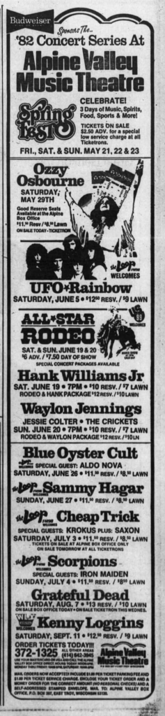 | 1982, Jul 3 | Alpine Valley Music Theatre | East Troy WI | USA |